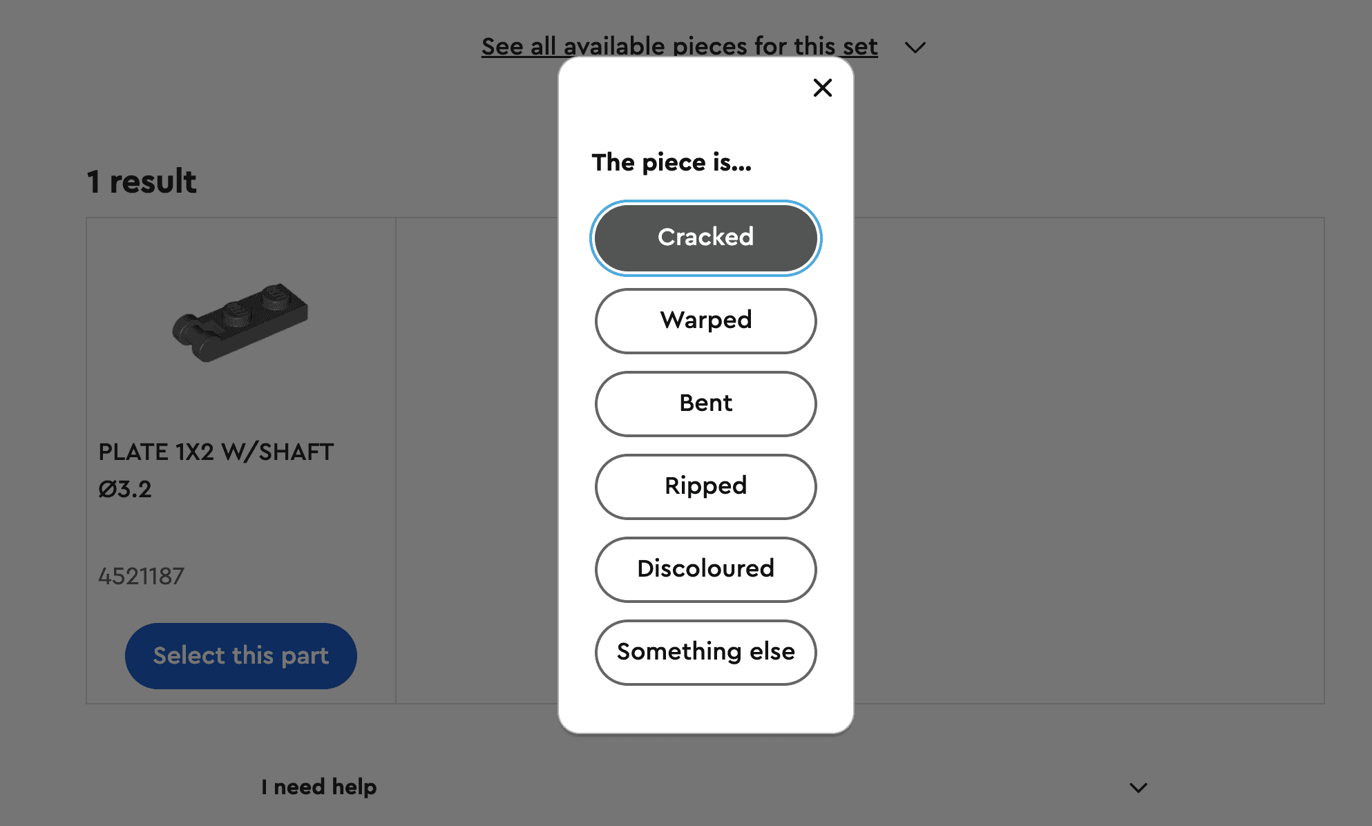 Lego understands that a little good will goes a long way in terms of customer satisfaction and convenience. To counter a common customer frustration, Lego has a super easy, streamlined web flow that allows customers to identify their set and select the pieces they need replacing. The customer simply adds the piece, selects a reason, and provides a shipping address for Lego to deliver to, free of cost.